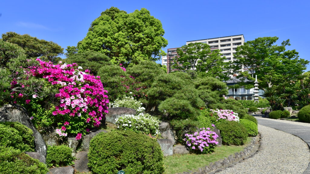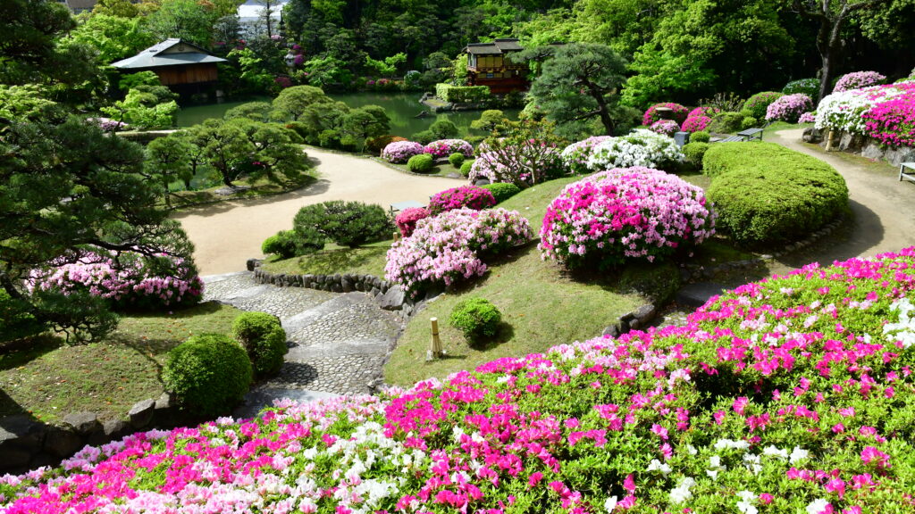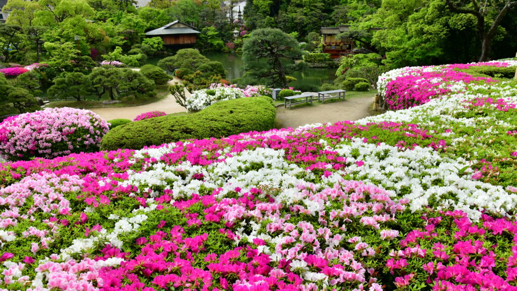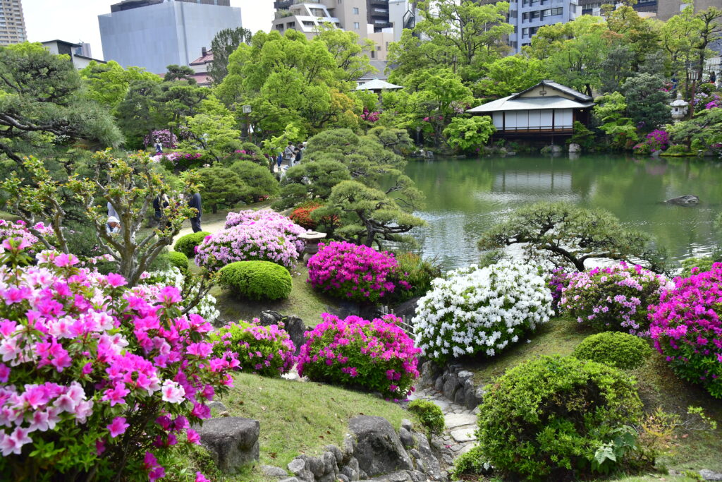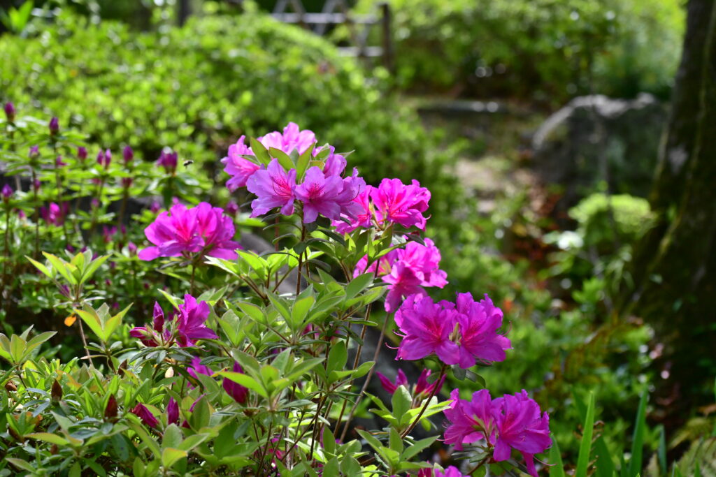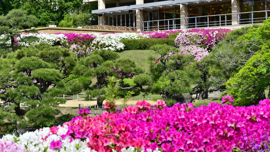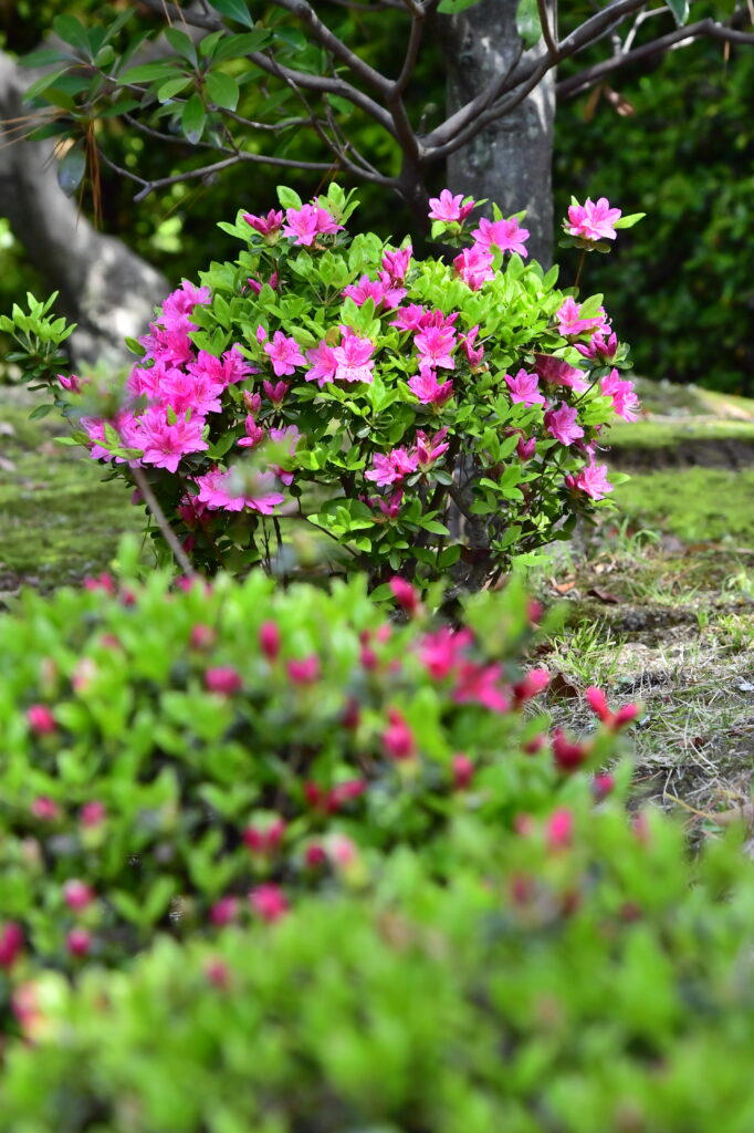 「五分咲き」から「八分咲き」になったころ気候もちょうどよく、緑の庭園の中でみるつつじは見ごたえがあり