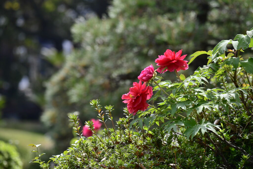 庭園の北側はまだつぼみが多いですが、メインの園路沿いは咲き始め、ピンクがちらほら目立ち始めました