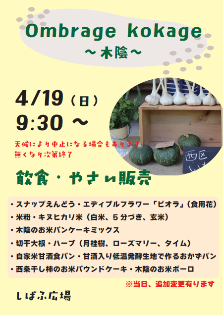 | 販売 内容 | ※当日追加、変更あり※数に限りがあります、無くなり次第終了 【販売予定内容】 ・スナップエンドウ・エディブルフラワー「ビオラ」(食用花)・キヌヒカリ米(白米、5分づき、玄米)・米粉 ・木陰のお米パンケーキミックス・切干大根・ハーブ(月桂樹、ローズマリー、タイム) ・柚子ジャム・八朔ジャム 〈フード〉 ・自家米甘酒食パン・甘酒入り低温発酵生地で作るおかずパン・西条干し柿のお米パウンドケーキ ・木陰のお米ボーロ ・・・など、お楽しみに! |